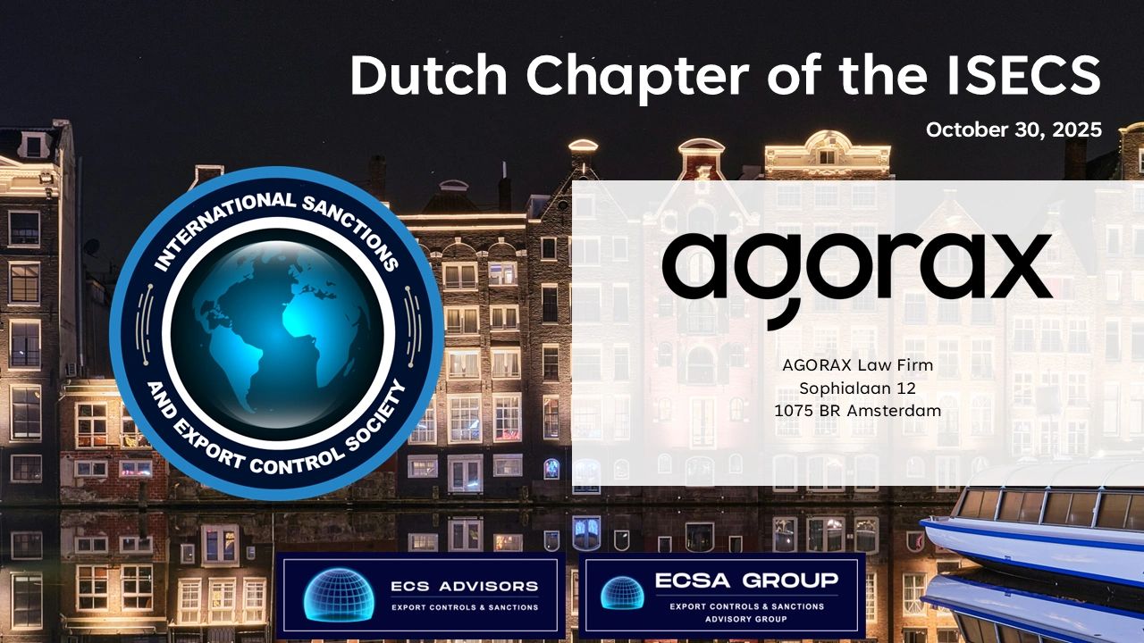 International Sanctions and Export Control Society and the Agorax Law Firm, Amsterdam, welcome members and participants from the region to attend our fall event. During this event, we will hear from sanctions and export control experts from Agorax, ECS Advisors, and the U.S. and Dutch Governments.